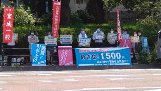 5月16日(日)の学習会(Zoom&YouTube配信)に続き、19日(水)には宮城県パート臨時派遣労働者連絡会と共同で昼休みに最低賃金引き上げの宣伝を行ないました。
